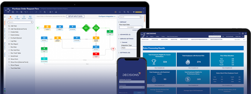 Decisions 是一個低程式碼平台,同時具備強大的無程式碼能力。大多數規則、工作流程和表單都可以使用拖放介面建置——無需編碼——這使得業務使用者可以輕鬆建立和管理邏輯,而無需等待IT 支援。