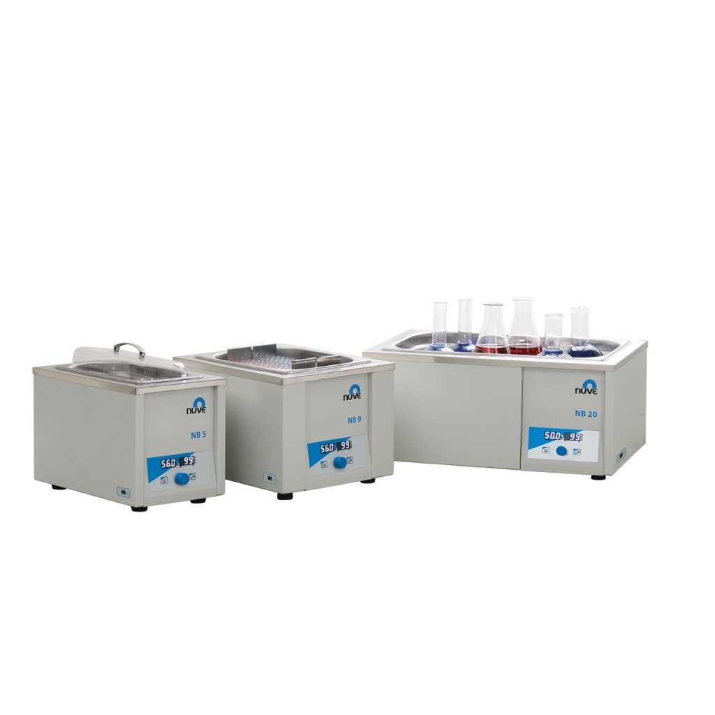 Since there is no pump or heating circulator in the bath, most of the area can be used for sample storage. The display is clearly visible and the drain valve allows for quick draining. The three models NB 5/9/20 are available and are designed for general and special applications in microbiology, research and industrial laboratories.