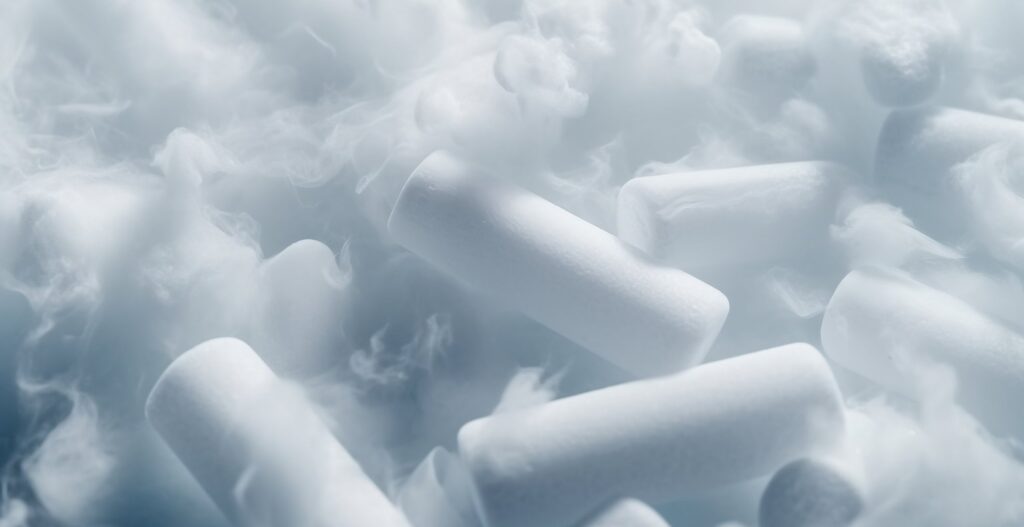 乾冰,也稱為固態二氧化碳,是一種常見的冷媒和冷凍劑,常用於運輸、儲存和冷藏需要持續低溫的物品。再食品業,乾冰通常用於運輸和儲存如速凍食品、生鮮食材和療冷食品等需要保持低溫的食品。在製藥和生物醫藥領域,乾冰常用於儲存和運輸生物製品,疫苗,醫療冷鏈產品以確保藥品在需要的低溫條件下儲存。乾冰也常用於冷凍試劑和生物樣品,在實驗室保持低溫條件非常重要。此外乾冰也被用於在化妝品、某些藥物和其他需要在一定溫度下保存的獨特產品中。