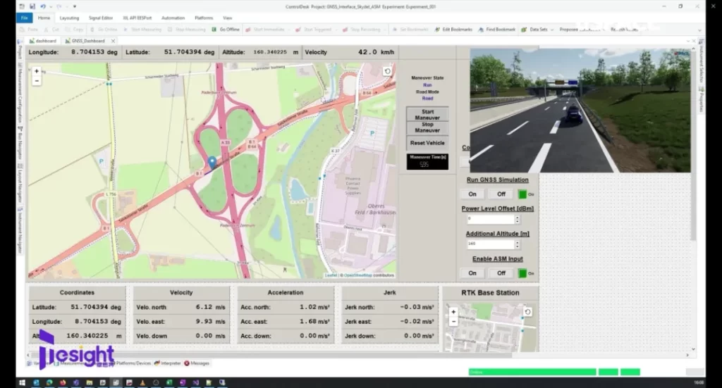 透過 GNSS 模擬器,可實現高精度的地理位置模擬與衛星訊號生成。當 GNSS 信號發生器整合至 dSPACE ASM 模型後,系統可自動選擇預設 GNSS 測試場景並控制信號發生器。