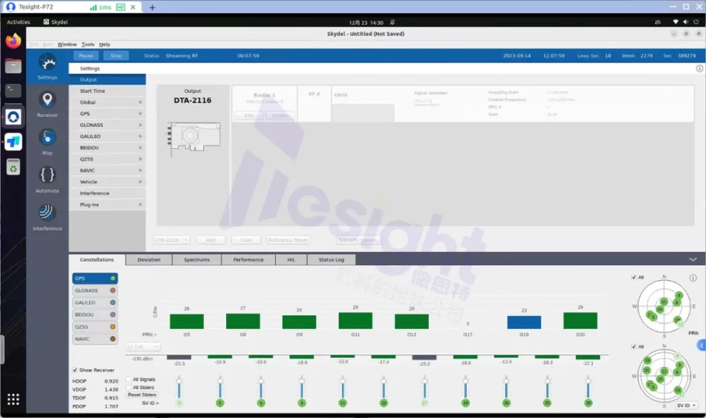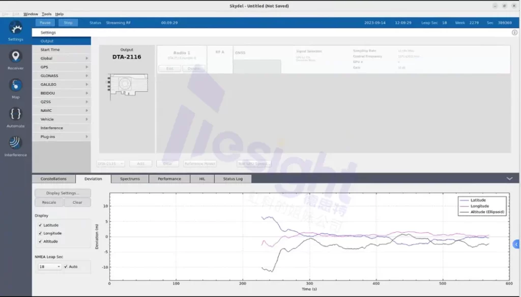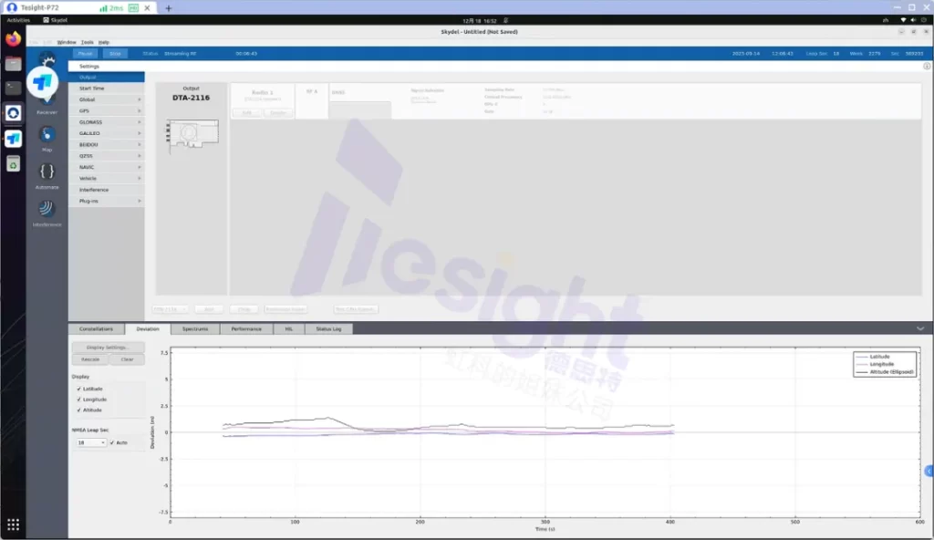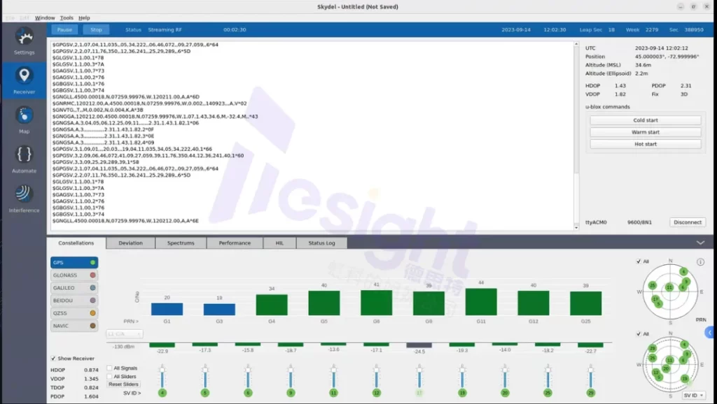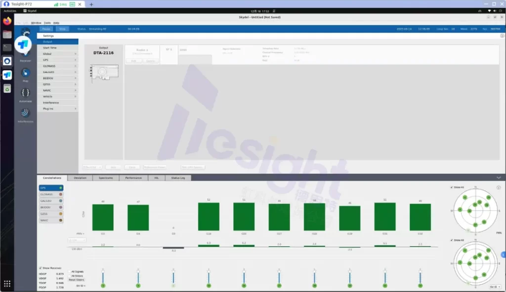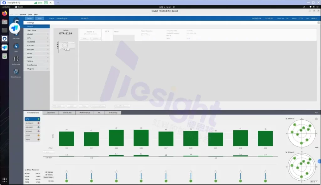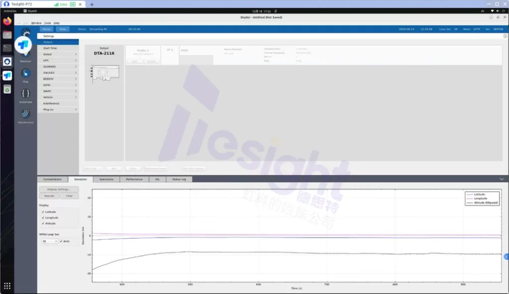 實測場景:選取靜態座標,啟用 GPS L1CA 進行模擬,分別添加/不添加高斯噪聲進行 10–15 分鐘 GNSS 模擬,並連接接收機觀測定位結果。