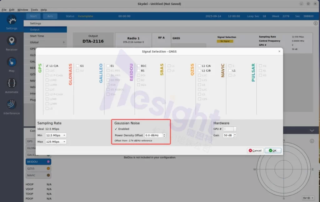 在虹科 GNSS 模擬器的設定介面中,系統提供了「高斯噪聲(Gaussian Noise)」配置選項,允許使用者在設定星座頻點後,依測試需求自由選擇是否啟用高斯噪聲疊加功能。在全球導航衛星系統(GNSS)的射頻模擬測試中,高斯白噪聲(AWGN)通常被視為模擬真實電磁環境的基準配置。然而,工程實踐證明,噪聲對接收機性能的影響並非線性單調關係。