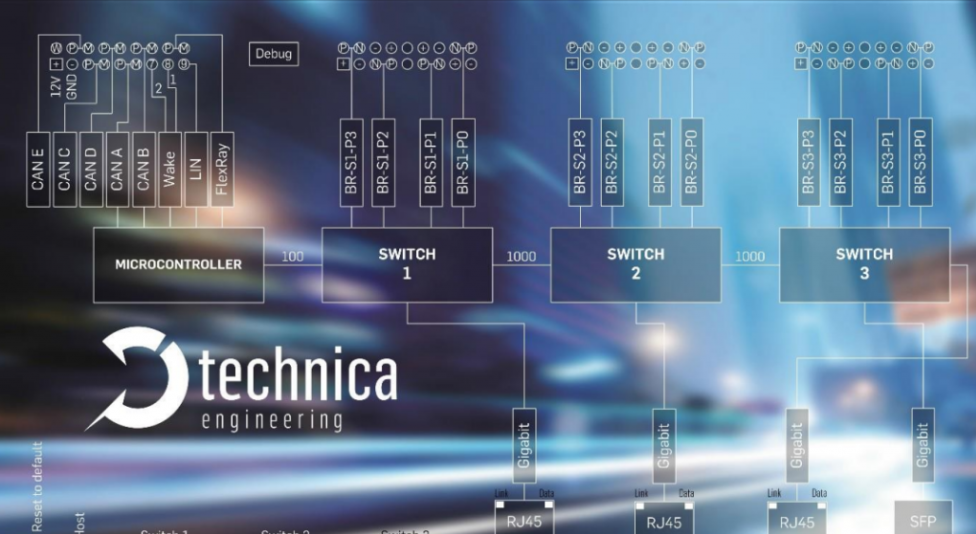 Media Gateway is a development tool for testing and analyzing in-vehicle networks. It allows users to disconnect and sequentially loop through up to 12 100BASE-T1 based devices at the physical layer and establish virtual point-to-point connections that can filter and control the data flow (routing, mirroring, forwarding).