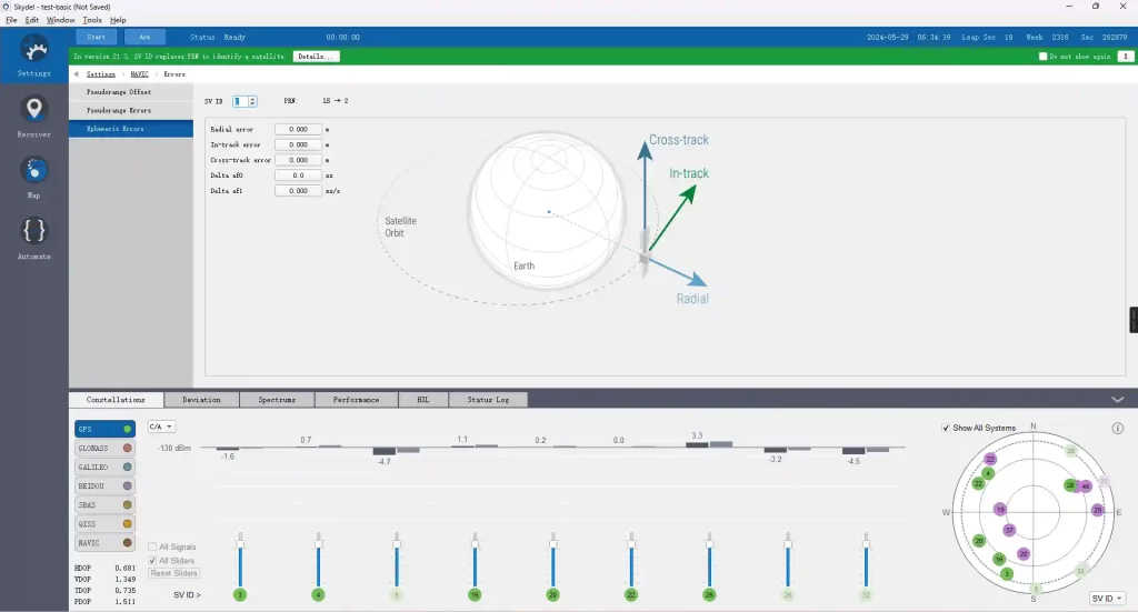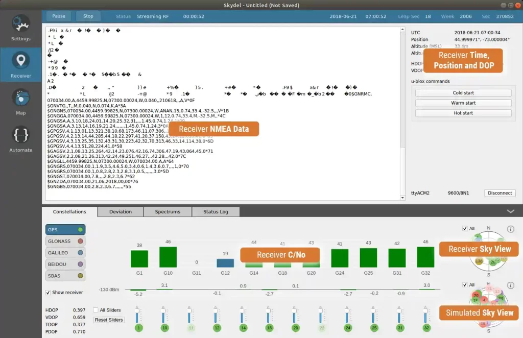 Skydel 支援對接收器/待測設備(DUT)的即時回饋監測,使用者可輕鬆監控 NMEA 數據、對 DUT 進行重新啟動,並同步查看模擬器與接收器的運行狀態。系統可顯示每顆衛星的接收器時間、位置資訊、DOP、天空視圖及 C/No 等關鍵指標,並實現仿真器與接收器之間的偏差觀測。