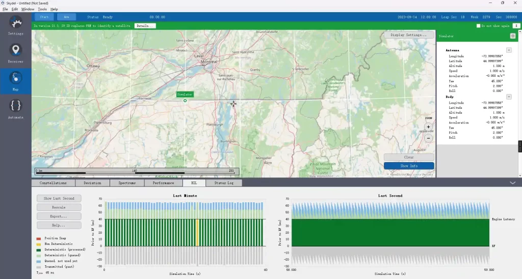 Skydel 支援進階的硬體在環(HiL)仿真與效能觀測,HiL 延遲可低於 10 ms,甚至低至 5 ms。系統內建完整的診斷與分析工具,可進行即時效能量測,為系統與使用者提供高度透明的測試資訊。