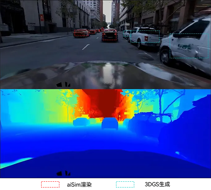 • 深度合成(Depth Compositing): 系統實時計算 3DGS 背景深度圖與 aiSim 前景物體的 Z-buffer,精確處理遮擋關係(如虛擬車輛行駛在真實樹木後方),並通過 環境光照信息(IBL) 融合陰影與反射。