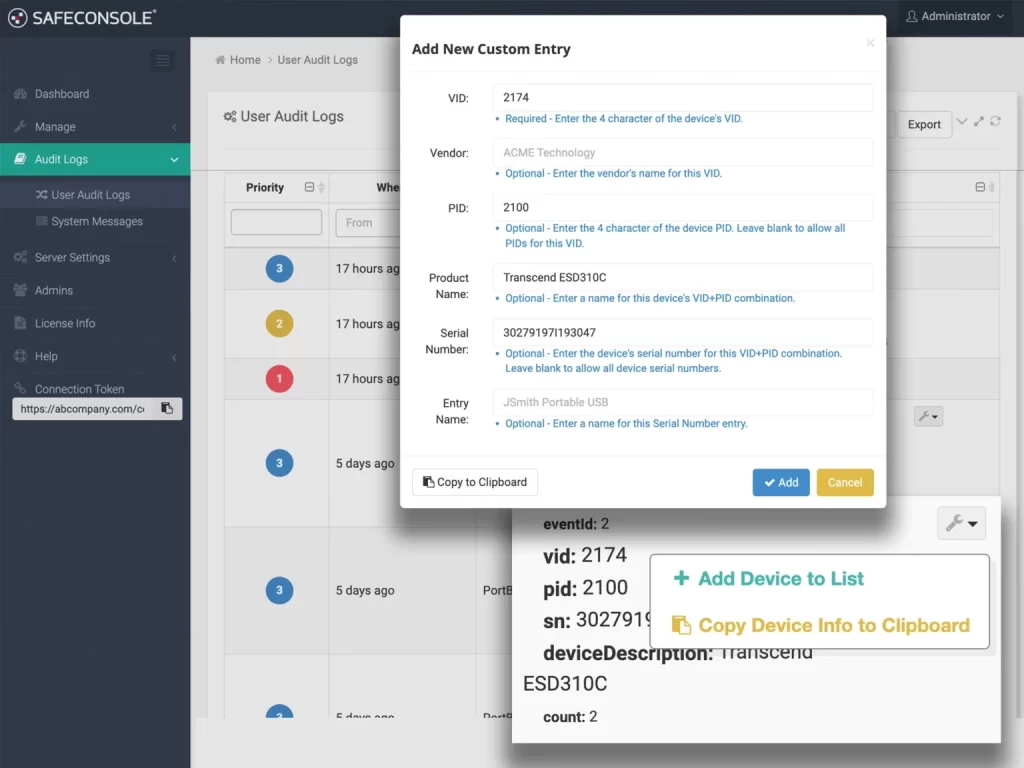當未經授權的USB設備插入連接埠時,PortBlocker將自動攔截。系統即時向管理員發送告警,並記錄至SafeConsole審計日誌。管理員僅需簡單操作,即可將設備按需加入臨時或永久白名單。