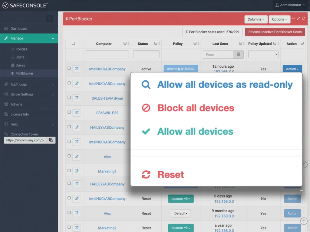 PortBlocker與SafeConsole深度集成,透過集中式USB策略管理,有效防範資料外洩與惡意軟體攻擊。