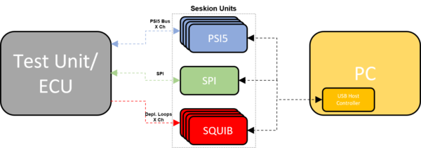 要為安全氣囊控制單元建立完整的 HiL 模擬,必須同時接入控制單元的內部加速度感測器訊號(SPI)以及周邊的加速度與壓力感測器訊號(PSI5)。此外,可搭配 SQUIB 盒進行點火時序的量測與分析。透過 USB 介面或網路連線至模擬器的 PC 系統,完成數據處理。